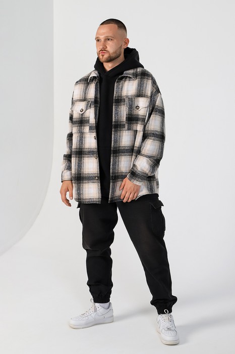 Рубашка мужская из тканого полотна с рисунком в крупную клетку, длинными втачными рукавами с разрезами на притачных манжетах, застегивающимися на обметанные петли и пуговицы, фигурной линией низа и стояче-отложным воротником. Полочки - с двумя нагрудными карманами и клапанами фигурной формы. Спинка - с притачной кокеткой, выкроенной по косой. В швах соединения манжет с рукавами обработаны по одной складочке. При эксплуатации изделия следует обратить внимание на то, что после ВТО и стирки материал дает усадку по ширине и длине.