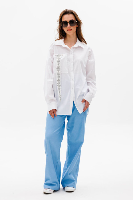Рубашка прямого кроя объёма оверсайз со спущенной линией плеча с асимметричным бочком. Горловина обработана рубашечным воротником с отрезной стойкой. Застёжка центральная на петли и пуговицы. Есть нагрудный карман. Низ рукава обработан притачной манжетой, застёгивается на пуговицы. В комплект к изделию идёт съемная декоративная нашивка.