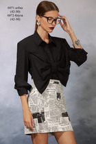 Блузка женская из смесовой ткани для повседневной носки прямого силуэта. Перед имеет принт и закругленную линию низа. Застежка на восемь обметанных петель и восемь пуговиц. Спинка имеет кокетку и две складки, а также закругленную линию низа. Горловина обработана рубашечным воротником с отрезной стойкой. Низ рукава обработан притачной манжетой с застежкой на одну обметанную петлю и одну пуговицу. Такой креативный вариант блузки обязательно привлечет к вам внимание. Блузка станет вашей любимой вещью в гардеробе.