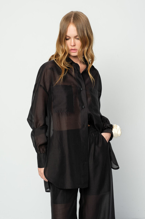 Детали: рубашка прямого силуэта, спущенная линия плеча, застежка на петли и пуговицы, длинные рукава с притачными манжетами, фигурный низ.