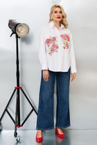 Блузка женская свободного силуэта из ткани. Блузка с цельнокроеной планкой и центральной застежкой на пуговицы. На левой детали переда накладной карман. Горловина круглой формы с рубашечным воротником. Плечо спущено, пройма углублена. Рукав втачной, короткий. Низ рубашки прямой.