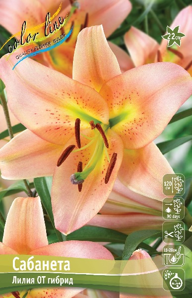светло-абрикосовый, горловина оранжево-лососевого цвета, сердцевина желтая, крап, H-120см