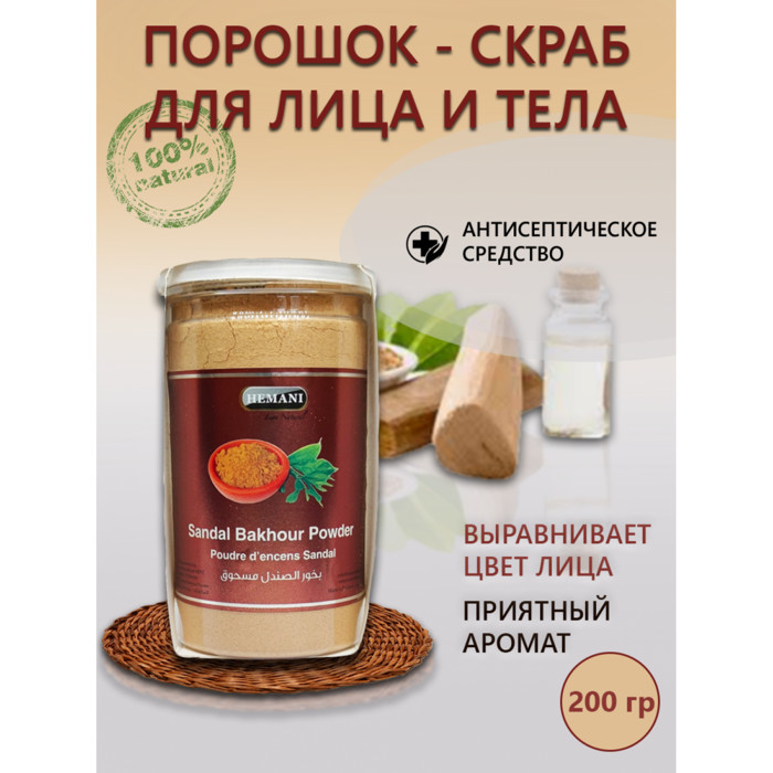 Сандал в виде порошка в баночке, содержит в себе эфирные масла сандала, широко применяющегося компонента не только в медицине, гигиенических процедурах, но также и в косметике и в парфюмерии. Данный порошок можно использовать в бахурнице, для обкуривания помещения. А также для спа процедур, т.к. целебные свойства сандала поистине безграничны. Он питает сухую кожу, нормализуя ее кислотно-щелочную среду, мягко, но в то же время весьма эффективно увлажняет ее, делая мягкой. Упругой и шелковистой. Экстракты сандала убирают с поверхности кожи шелушащийся слой, заживляет проблемные участки. Обладая специфическим приятным запахом, способен Вас растворить в море неги, блаженства, природной среды…