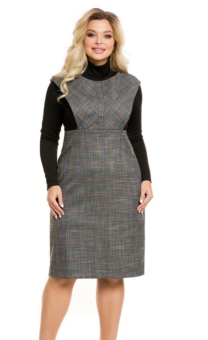 Удобный повседневный сарафан, прилегающего силуэта, выполнен из костюмной ткани. Сарафан с отрезной юбкой. Юбка с цельнокроеным поясом и завышенной линией талии. Перед юбки целый, спинка со средним швом, шлицей длиной 21 см. и двумя вертикальными вытачками. В боковом шве юбки застежка на потайной замок-молнию, длиной 20 см. Верх сарафана по переду с настрочной планкой по центру. Спинка целая. Вырез горловины в форме лодочка и проймы переда и спинки обработаны обтачками. Сарафан на подкладе. Длина изделия по спинке в 46 р-ре – 100 см. в 58 р-ре – 106 см.