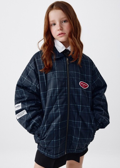 Стеганый бомбер оверсайз с отложным воротником и декоративными нашивками. Плотная плащевая ткань в клетку с водоотталкивающей пропиткой. Свободный крой со спущенной линией плеча и длинными объемными рукавами. Вместительные прорезные карманы по бокам. Застежка на металлическую молнию. Резинка на манжетах и по низу изделия. Утеплитель из синтепона весом 60 гр. Рекомендованный температурный режим*: +15/+10. Школьная коллекция. На ребенке представлен размер 140.
