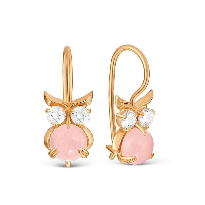 Серьги детские из золочёного серебра с розовым кварцем и фианитами
