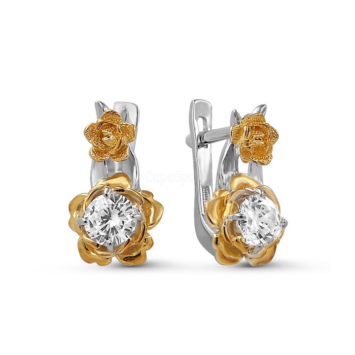 Серьги из родированного серебра с фианитами и частичным золочением - Розы 925 пр