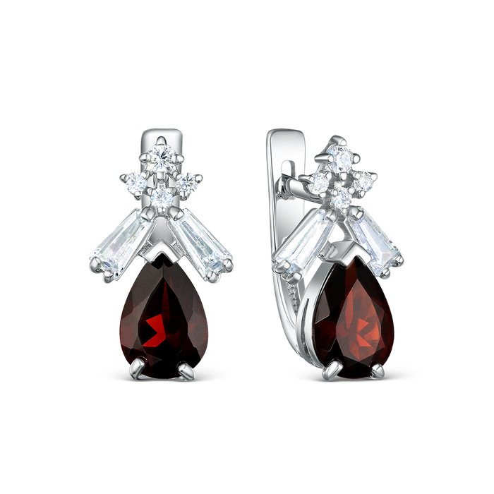 Серьги из серебра с натуральным гранатом и фианитами родированные 925 пробы 0207