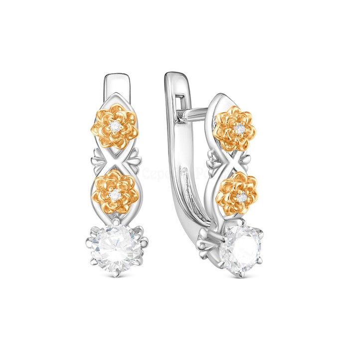 Серьги из серебра с синтетическим муассанитом, фианитами и позолотой родированны