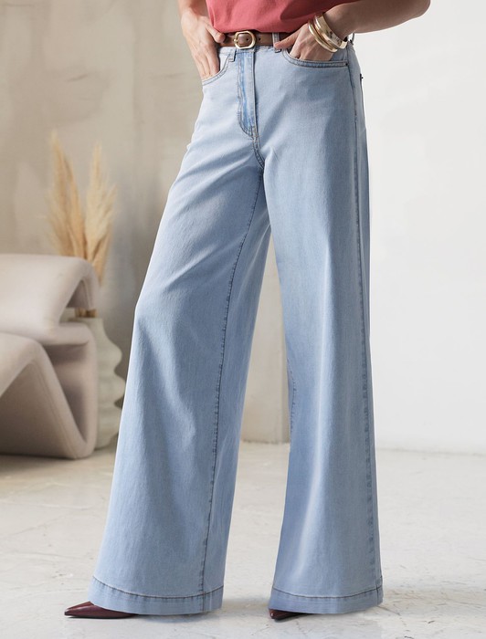 Состав: 80%Хлопок 18%ПЭ 2%ПУ Плотность: 8 OZШирокие джинсы светло-голубого цвета выполенены из облегченного денима плотностью 8 OZ, они идеально подходят для весны и лета. После пошива изделие подвергли специальному виду вошинга — salt-stone washing (солт-стоун вошинг), что дословно значит стирка с каменной солью. Такой вид вошинга позволяет получить стильные потертости на голубых оттенках денима. Свободные джинсы идеально подойдут для девушек и женщин размера plus size (плюс сайз) с широкими бедрами, скроют недостатки и подчеркнут достоинства фигуры, Высокая посадка и прямой крой визуально вытягивают силуэт. Качественная надежная фурнитура делает добавлет образу премиальности. Широкие легкие джинсы не стесняют движений, позволяя чувствовать себя комфортно даже в жаркую погоду. Базовые летние джинсы не только удобные, но и практичные для повседневной носки, благодаря натуральному материалу и продуманному крою. Джинсы трубы всегда актуальны и незаменимыми для базового гардероба.