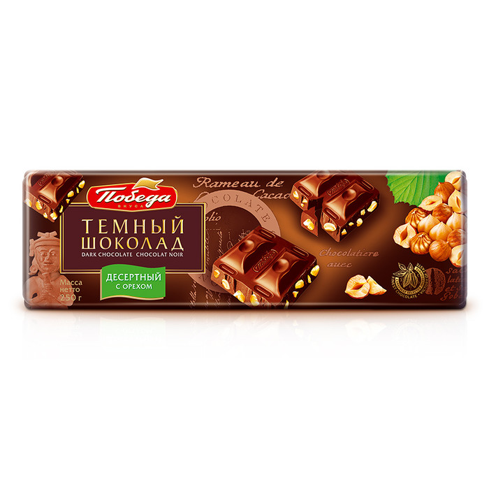 Десертный шоколад «Победа» отличается повышенным содержанием какао-бобов особой мягкой обжарки. В этом идеально сбалансированном рецепте много какао-бобов (50 %), натуральная ваниль и лесной орех. Во вкусе бархатистую текстуру темного шоколада сопровождает молочный ореховый вкус с ванильными нотками.