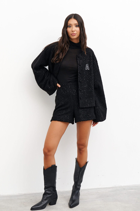 Шорты прямого кроя выполнены из полотна букле черного цвета с пайетками. Характеристики: прямой крой, подкладка, пояс на резинке. Длина по боковому шву 38 см.