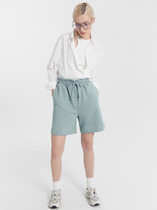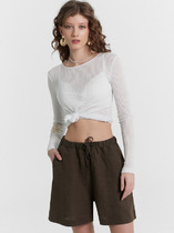 Шорты свободного кроя. Выполнены из текстильного полотна кофейного цвета в полоску. А-силуэт. Пояс на резинке. По передней части имитация застежки на 3 пуговицы. Карманы-хулиганы. По передней и задней части вертикальные швы. Длина 37 см