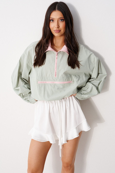 Шорты свободного кроя, выполнены из струящайся ткани белого цвета. Пояс на резинке с кулиской, по низу шорт нашита рюша из ткани основного изделия. Длина по боковому шву с учетом рюши - 34 см.