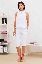 Шорты льняные короткие, на притачном поясе со шлёвками, в которые втянут шнурок из льна контрастного цвета, застежкой-гульфик. Пояс застегивается на петлю-пуговицу. По переду карманы от бокового шва. По спинке вытачки от пояса. Низ шорт окантован льном контрастного цвета. Шорты без подкладки.