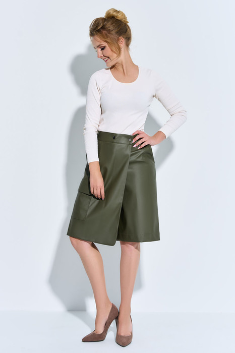 Юбка -шорты выполены из эко-кожи. Шорты завышенной посадки на притачном поясе с резинкой. По передней брючине   пола с накладным карманом.  В боковых швах расположены функциональные карманы.