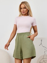 Шорты свободные, средней длины, с карманами в боковых швах, на поясе сиэластичной тесьмой внутри.