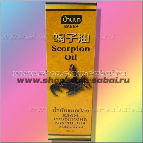 Скорпион масло для массажа 85 мл Scorpion Oil Banna 85 ml Тайское масло для массажа, содержащее в составе сильнодействующий компонент яд скорпиона с основой из масла куркумы, кокосового масла и масла камфорного дерева , для эффективного снятия боли в мышцах и суставах, для снятия боли при межпозвоночной грыже, при защемлении нервных корешков, для лечебного эффективного массажа от тайского производителя бренда Banna. Масло с ядом скорпиона стимулирует кровообращение, и применяется для снятия боли и усталости в мышцах, снятие боли в спине, а также очень эффективно при лечебном массаже при неврологических заболеваниях: при параличе, парезах конечностях, при онемении и нарушении иннервации. Тайское масло с ядом скорпиона обладает выраженными стимулирующим, разогревающим, противовоспалительным, расслабляющим действиями, разгоняет кровь, устраняет дискомфорт, судороги, боль и онемение. Объём масла с ядом скорпиона для массажа 85 мл.