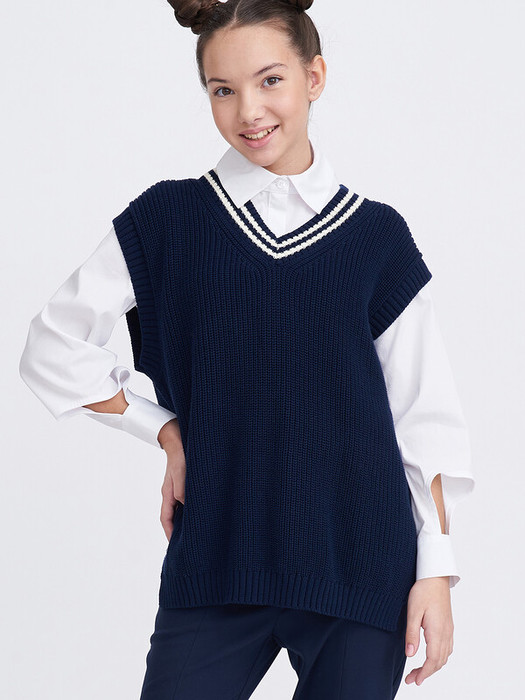 Стильный вязанный жилет унисекс с V-образным вырезом из хлопковой пряжи прямого фасона. Боковые швы дополнены разрезами. Низ жилета, пройма рукавов и вырез горловины оформлены фактурной резинкой, вдоль горловины резинка контрастного цвета. Жилет выполнен из 100% хлопка, что обеспечивает отличную воздухопроницаемость и комфорт в повседневной носке.