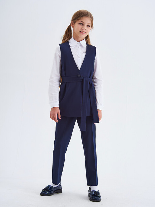 Удлиненный трикотажный жилет для девочки на подкладке с V образным вырезом. Жилет застегивается на пуговицу и пояс. В боковых швах расположены карманы.