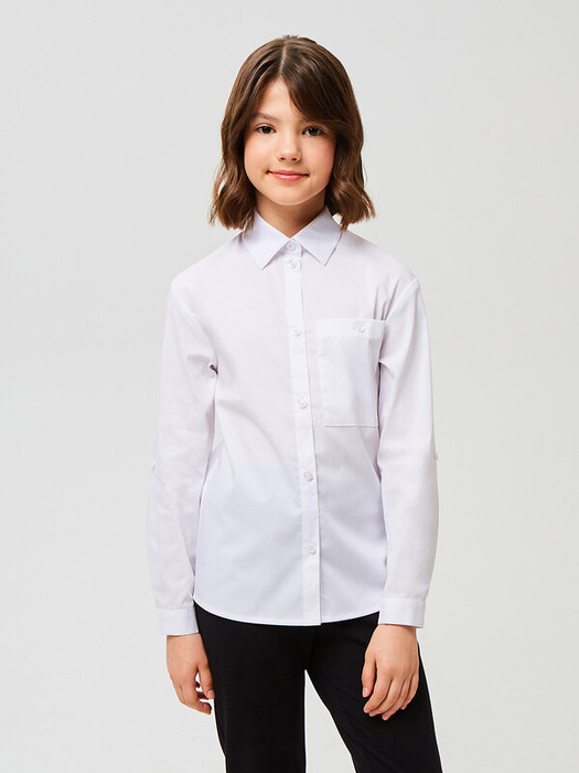 Классическая блузка для подростков из смесового хлопка с отложным воротником на стойке и длинными рукавами на манжете. Рукава декорированы патой и пуговицей позволяющей собрать рукав. Левая сторона полочки дополнена накладным карманом. Застежка центральная на планку с пуговицами. Высокое содержание хлопка в составе обеспечивает отличную воздухопроницаемость и комфорт в повседневной носке. Блузка будет прекрасным дополнением к моделям из школьной коллекции SMENA.