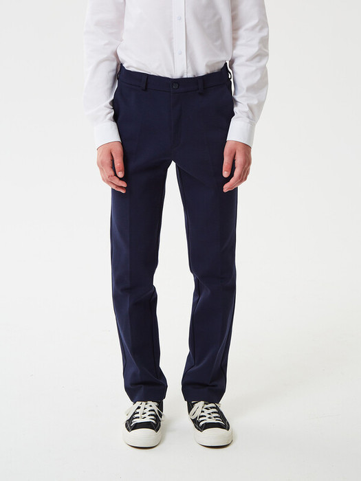 Брюки зауженные из трикотажа джерси для мальчика. Пояс с еврорезинкой сзади. На передней части брюк боковые карманы, горизонтальные защипы и застёжка - гульфик на молнии. На правой задней половинке брюк - карман с узкой листочкой. Отличный вариант на каждый день.