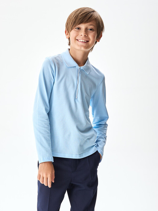 Поло из 100% хлопка с длинными рукавами и отложным воротником рубашечного типа, с центральной укороченной застежкой по переду на молнии.