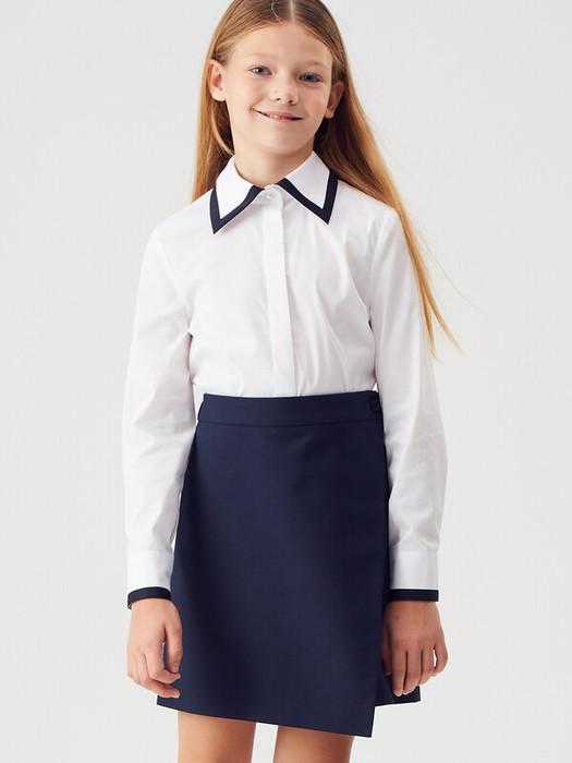 Стильная блузка из смесового хлопка полуприлегающего силуэта с отложным воротником и длинными рукавами на манжетах. Воротник и рукава декорированы контрастной вставкой. Застежка на планку с пуговицами. Высокое содержание хлопка в составе обеспечивает отличную воздухопроницаемость и комфорт в повседневной носке.