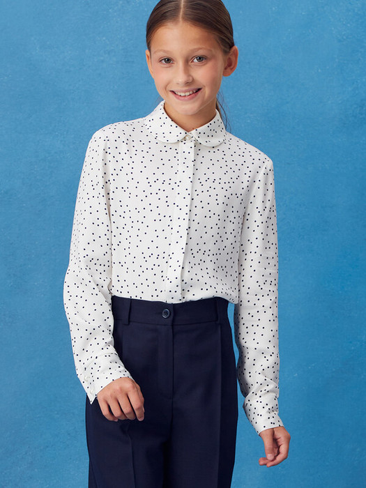 Блузка с узором сразу покажет, кто в толпе одноклассников самый модный. Белая блузка выполнена в прямом крое, универсальном и всегда удобном для любого типа фигуры, с небольшим отложным воротником и манжетами. Ткань украшает россыпь мелких чёрных точек, что одновременно делает модель оригинальной и позволяет носить буквально везде. И к школьной форме, и к повседневным джинсам она подойдёт как нельзя лучше.