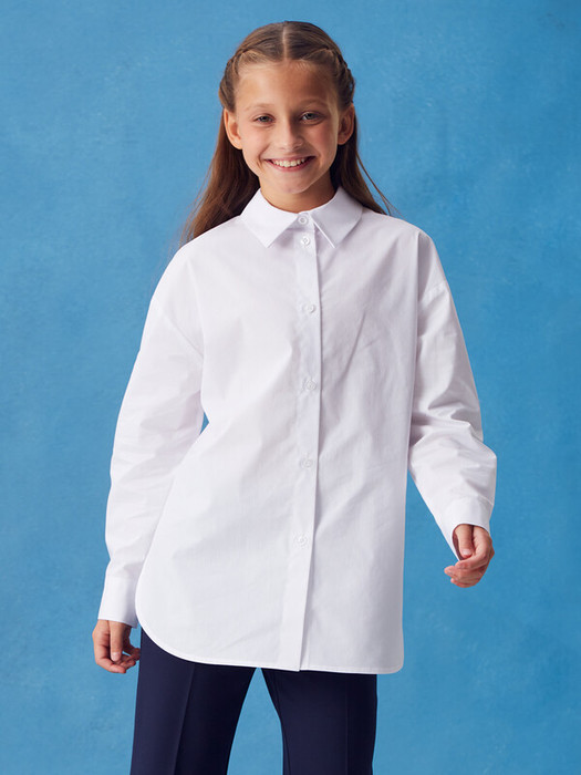 Недостающий пазл в гардеробе девочки — свободная белая блузка оверсайз силуэта! Блузка выполнена из смесового хлопка. Высококачественный материал прекрасно дышит, держит форму и идеально подходит для образов на каждый день. Блузку с удлиненной линией можно сочетать с зауженными или прилегающими брюками, носить как самостоятельный элемент или надевать поверх базовых футболок, чтобы создать более расслабленный и непринужденный комплект. Блузка застёгивается на пуговицы. Модель дополнена декаоративным элементом на спике в виде планки с пуговицами. "