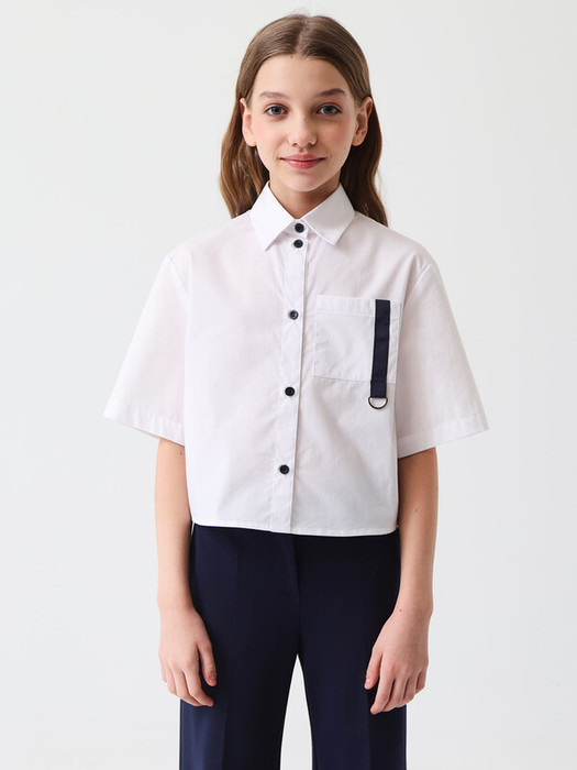 Укороченная блузка свободного силуэта для подростков из смесового хлопка с отложным воротником со стойкой и короткими свободными рукавами. На полочке расположен накладной карман с декоративным элементом. Застежка на планку с пуговицами. Высокое содержание хлопка в составе обеспечивает отличную воздухопроницаемость и комфорт в повседневной носке. "
