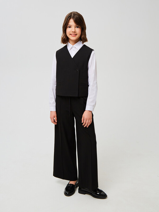 Брюки палаццо для девочек изготовлены из немнущейся костюмной ткани высокого качества, которая идеально подходит для брюк данного фасона. Расширяющийся от пояса силуэт, высокая талия и пояс на резинке не стесняют движений. Для регулировки объема пояс дополнен шнуром. Брюки имеют карманы достаточной глубины. "