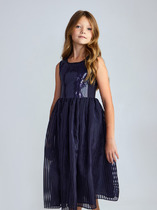 Длинное платье с высокой линией талии, с мягкой хлопковой подкладкой. Лиф украшен россыпью блестящих пайеток. Модель без рукавов, с потайной застежкой на молнии. Но изюминкой становится многослойная пышная юбка с сеткой.  Каждая деталь продумана так, чтобы выглядеть стильно и празднично.