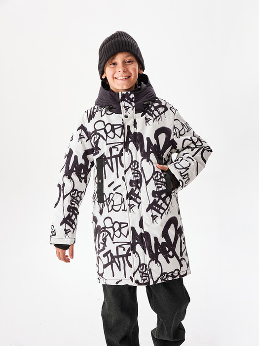 Куртка прямого силуэта в черно-белой трендовой расцветке с водонепроницаемым покрытием. Утеплитель синтепон пластовой 200 гр/м2.  Манжет из ткани "Soft Stretch"прочная внешняя поверхность и мягкий внутренний слой с велюровым ворсом. Температурный режим до минус 15 градусов. Изделие дополнено съемным объемным капюшоном и боковыми карманами, которые защитят от ветра и дождя в любую погоду. Застежка - на молнию закрыта ветрозащитной планкой на кнопках. Воротник - стойка, переходящая в капюшон. Доступна в 2 цветах.