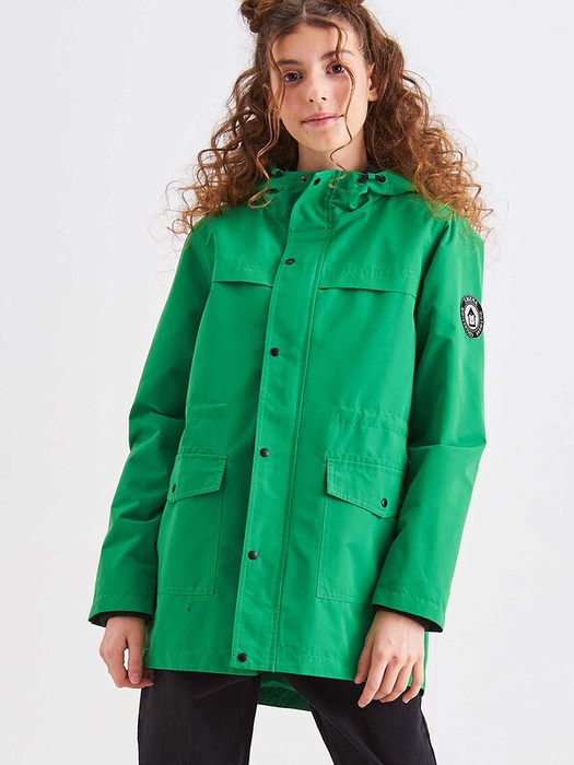 Куртка-ветровка на хлопковой подкадке c несъемным капюшоном. Внутри кулиска со шнурком для регулировки ширины изделия, в рукавах трикотажные манжеты, два накладных кармана с клапаном.