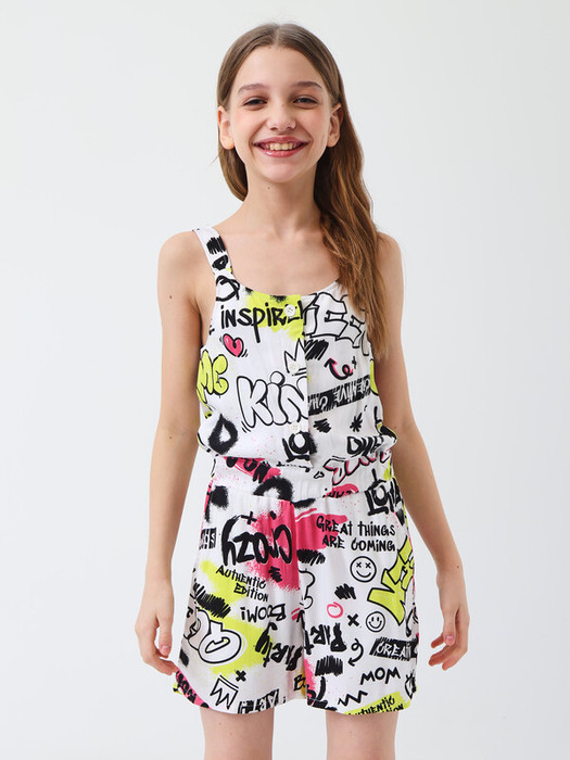 Легкий комбинезон с шортами станет незаменимым предметом гардероба в жаркую погоду. Его можно использовать и как самостоятельный предмет образа, так и дополняя его нижним слоем в виде футболки или рубашкой с коротким рукавом. Стильная граффити расцветка с текстовыми надписями позволяет использовать как светлые, так и темные акценты в аутфите. Модель подчеркивает фигуру благодаря эластичной резинке на поясе и приталенному крою. В легком, но не просвечивающем материале будет комфортно и в городе, и на отдыхе.