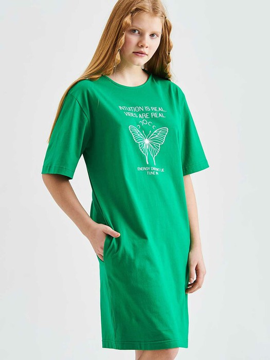 Трикотажное платье  свободного силуэта с принтом на полочке и фигурным вырезом по спинке  изделия.