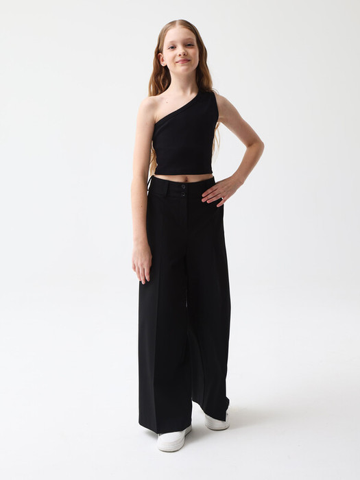 Костюмные широкие брюки со стрелками. Эластичная костюмная ткань из поливискозы. Свободный крой с высокой посадкой на талии. Пояс со шлевками для ремня и резинкой сзади, для лучшей посадке по фигуре. Застежка на молнию и 2 пуговицы. Функциональные карманы с отрезным бочком. Размерный ряд 128 – 176 см.