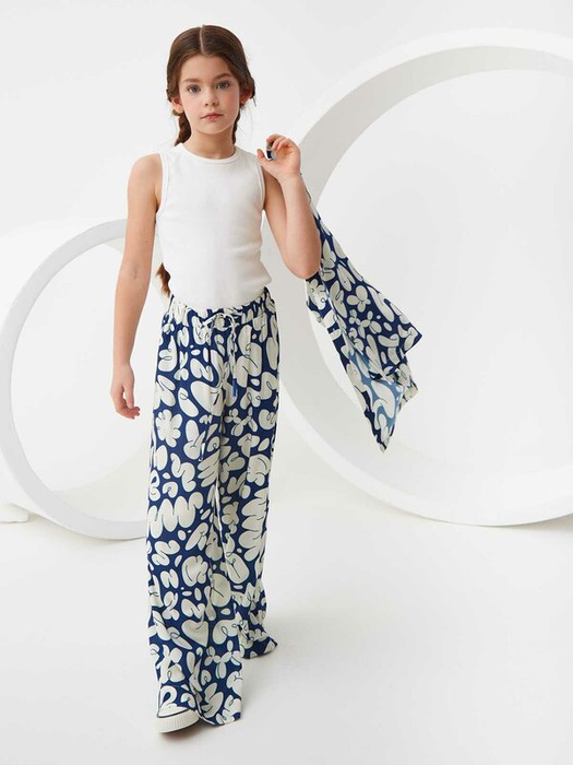 Широкие брюки из легкой струящейся ткани из 100% вискозы. Приятная на ощупь ткань не потеряет своего первоначального вида после множества стирок. Ткань хорошо пропускает воздух и не закатывается. Расслабленный силуэт с комфортной средней посадкой талии. Эластичный пояс с кулиской. Прорезные карманы в боковых швах и брючины полной длины. Размерный ряд 128 – 176 см.