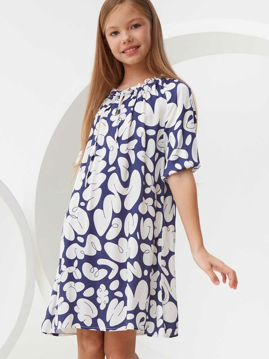 Платье летнее из 100% вискозной ткани. Платье без подкладки и без застежки. Силуэт платья расклешается книзу. По центру переда от горловины обработан разрез. Рукава короткие, покроя реглан. Низ рукавов вложена резинка. Вырез горловины широкий. В кулису вложена завязка из косой бейки из основной ткани,. Завязка присобирает горловину платья и завязывается на бант. Низ платья застрочен швом вподгибку с закрытым срезом. Размерный ряд 116-152 см.