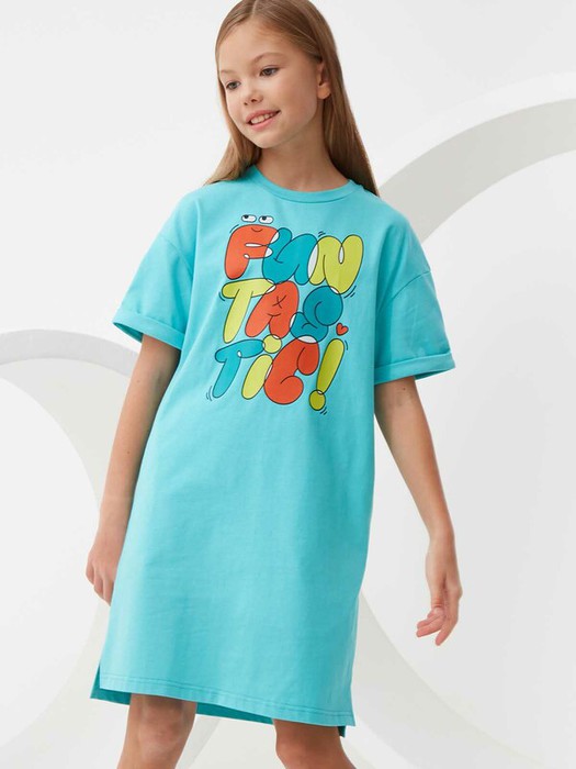 Платье-туника оверсайз силуэта с ярким принтом FANTASTIC! (с англ. «фантастический!»). Мягкий трикотаж из 100% хлопка. Свободный крой со спущенной линей плеча. Круглый вырез горловины и короткий рукав с манжетами. Прямой силуэт, спереди платье на пару сантиметров короче, по бокам небольшие разрезы. В боковых швах функциональные прорезные карманы. Размерный ряд 128 – 176 см.
