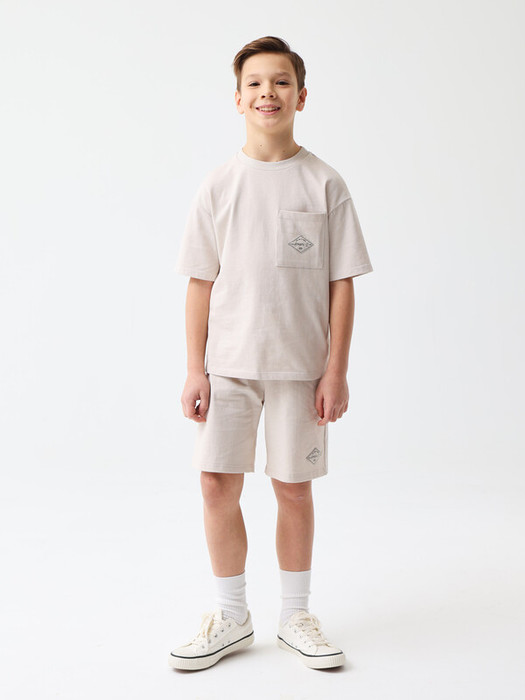 Однотонный трикотажный комплект из футболки и шортов. Футболка из мягкого трикотажа из 100% хлопка. Прямой крой со спущенной линей плеча. Круглый вырез горловины. Один накладной карман на груди. На кармане нашивка. Однотонные шорты повторяют нашивку на кармане футболки. Мягкий трикотаж из 100% хлопка. Свободный крой, средняя посадка, эластичный пояс с кулиской. Функциональные скошенные карманы по бокам и один накладной карман сзади. Размерный ряд 116 – 176 см.