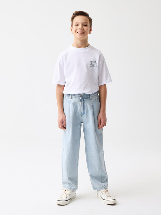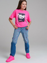 Джинсы Slouchy с вытачками по низу. Плотный деним из 100% хлопка. Свободный крой со слегка зауженными к низу брючинами полной длины. Высокая посадка талии и пояс с внутренней регулируемой резинкой. Застежка на молнию и пуговицу, шлевки для ремня, пять карманов. Представлены в 3 цветах – светло-голубой, табачный, молочный. Размерный ряд 128 – 176 см.