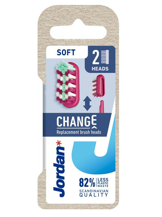 2 мягкие сменные насадки для зубной щетки Jordan Change. Зубная щетка Jordan Change — революционная новинка! Зачем выбрасывать всю щетку, если можно просто заменить насадку? Щетка очень качественная, легкая и удобная в использовании. При каждой смене насадки экономится 82% пластика. 100% переработанный пластик*. *без щетины. .
