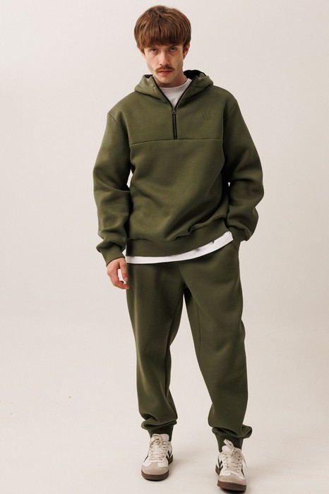 Этот спортивный костюм от GOwear отлично подойдет для дома, прогулок, путешествий и отдыха. Сделан из теплой, комфортной ткани. Состоит из джемпера и брюк. Джемпер имеет двойной капюшон и короткую застежку - молнию черного контрастного цвета по центру переда. На переде с левой стороны выполнена вышивка в цвет ткани, а также расположена горизонтальная кокетка. Джемпер имеет прямой силуэт. Низ джемпера и манжеты выполнены из кашкорсе. Брюки зауженные к низу с притачным поясом (резинка и шнурок внутри). Брюки с боковыми карманами. По низу брюк – манжеты.