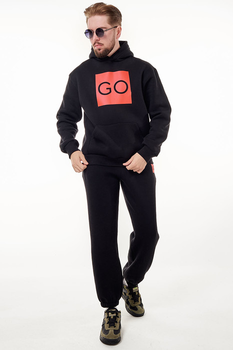 Костюм комфортный покроя oversize, спортивного стиля из комфортной ткани (футера с начесом). Костюм состоит из худи и брюк. Худи прямого силуэта, с притачной манжетой по низу изделия. Худи имеет двойной капюшон и карман - кенгуру. На переде контрастная печать GO. Рукава втачные с манжетой. Брюки с притачным поясом с резинкой и шнурком внутри. Передняя половинка брюк с боковыми карманами. Низ брюк присобран на резинку.