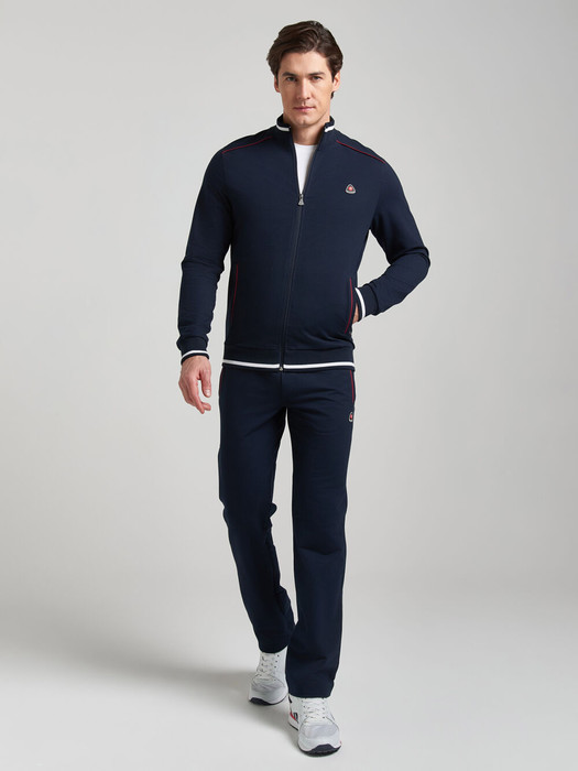 Спортивный костюм из хлопкового трикотажного полотна. Кокетки на куртке выполнены из ткани контрастного цвета. В швах притачивания кокеток проложен кант белого цвета. Карманы на куртке и брюках прорезные с листочками на молнии. Листочки выполнены из полотна контрастного цвета с белыми кантами. Посадку по фигуре обеспечивает эластичная рибана по воротнику, поясу и манжетам. Брюки прямые с накладным карманом на задней половинке. Пояс по линии талии регулируется шнурком. На брюках и полочке настрочен шеврон с фирменным логотипом.