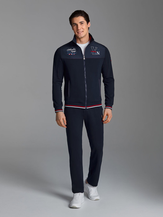 Спортивный костюм из хлопкового трикотажного полотна. Куртка с центральной застёжкой на молнии. Карманы на куртке расположены в швах отрезных бочков, на листочке с молнией. Рукава втачные с отрезными вставками. Отрезные кокетки декорированы плащевой тканью. Посадку по фигуре обеспечивает эластичная рибана по поясу и манжетам. Воротник из основной ткани из двух частей, контрастного цвета. Брюки прямые с боковыми карманами без молний. На задней правой половине брюк выполнен прорезной карман с листочкой на молнии. Пояс по линии талии регулируется шнурком. На левом рукаве и левой половине брюк настрочен шеврон с фирменным логотипом и расположена вышивка "Yachting". На правой полочке стильная вышивка "Atlantic". На левой полочке вышивка "Yachting Navigation".