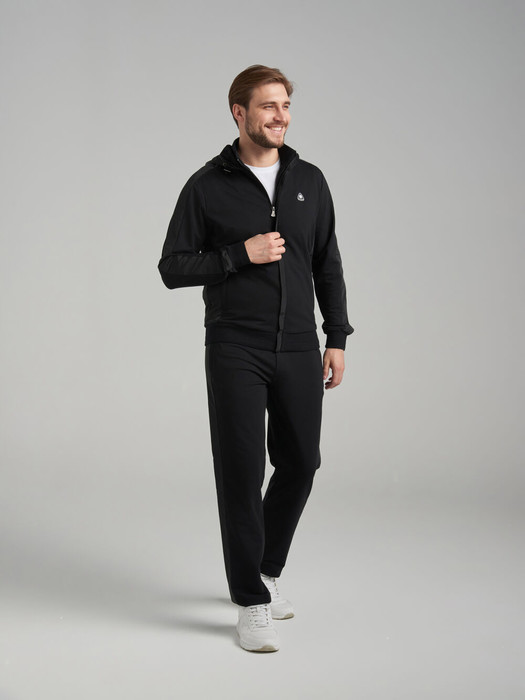 Спортивный костюм из хлопкового трикотажного полотна. Куртка костюма на поясе, с воротником-стойкой, с легким капюшоном, застегивается на молнию. Рукава втачные. Несколько деталей костюма изготовлены из водонепроницаемой плащевой ткани в тон изделия - это капюшон, вставки рукавов, переходящие в плечевые кокетки, бочки куртки, боковые вставки брюк. Ветрозащитная планка из плащевой ткани закрывает молнию. Все карманы комплекта застегиваюся на молнии и расположены в швах боковых деталей, Лицевая часть капюшона регулиреутся резиновым шнуром с помощью металлических фиксаторов.Пояс, воротник и манжеты куртки изготовлены из эластичного подвяза. Брюки прямые, зауженные книзу. Пояс брюк по линии талии с эластичной резинкой так же дополнительно регулируется шнуром. На левой груди и под левым карманом брюк нашиты шевроны с фирменным логотипом
