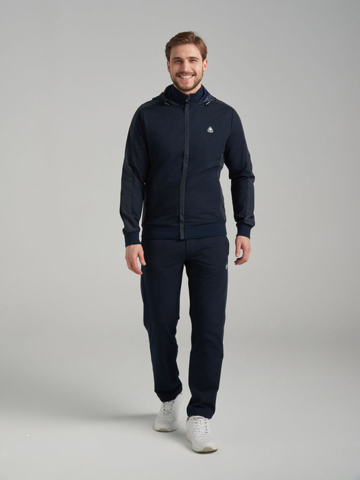 Спортивный костюм из хлопкового трикотажного полотна. Куртка костюма на поясе, с воротником-стойкой, с легким капюшоном, застегивается на молнию. Рукава втачные. Несколько деталей костюма изготовлены из водонепроницаемой плащевой ткани в тон изделия - это капюшон, вставки рукавов, переходящие в плечевые кокетки, бочки куртки, боковые вставки брюк. Ветрозащитная планка из плащевой ткани закрывает молнию. Все карманы комплекта застегиваюся на молнии и расположены в швах боковых деталей, Лицевая часть капюшона регулиреутся резиновым шнуром с помощью металлических фиксаторов.Пояс, воротник и манжеты куртки изготовлены из эластичного подвяза. Брюки прямые, зауженные книзу. Пояс брюк по линии талии с эластичной резинкой так же дополнительно регулируется шнуром. На левой груди и под левым карманом брюк нашиты шевроны с фирменным логотипом